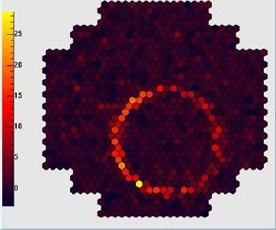Figura 2. La caratteristica traccia circolare sul rivelatore del telescopio SST lasciata dalla luce Cherenkov prodotta da un muone atmosferico