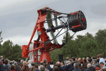 SST-2M, il prototipo dei telescopi di piccola taglia che comporrà parte della estesa rete di rivelatori del Cherenkov telescope Array, CTA. L’immagine è stata presa in occasione dell’inaugurazione dello strumento, il 24 settembre 2014, presso la stazione osservativa di Serra La Nave sull’Etna, gestita dall’Osservatorio Astrofisico di Catania dell’INAF