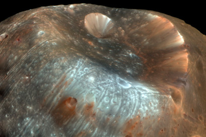 Facciamocene una ragione: Phobos, la maggiore delle due lune di Marte, è destinata a finire in mille pezzi. E’ ormai accertato che il corpo celeste si sta lentamente ma inesorabilmente avvicinando al Pianeta rosso, al ritmo di qualche centimetro all’anno e gli scienziati sono abbastanza concordi nel segnare la fine di Phobos in un’intervallo di tempo che oscilla tra 20 e 50 milioni di anni. Ma molto probabilmente non ci sarà un mega impatto con Marte: la luna si disintegrerà prima di raggiungere la sua superficie. Ne avevamo parlato qualche giorno fa qui su Media INAF, riportando le indagini di alcuni scienziati del Centro Goddard della NASA. A rafforzare questa ipotesi arriva ora un nuovo studio condotto da Benjamin Black e Tushar Mittal, due giovani ricercatori dell’Università della California a Berkeley, pubblicato sull’ultimo numero di Nature Geoscience. L’indagine mette in evidenza che le rocce di Phobos non riusciranno a resistere alle forze mareali di Marte all’avvicinarsi al pianeta. Dunque la luna, il cui diametro medio è di circa 22 chilometri, si sbriciolerà letteralmente ben prima di impattare sul suo pianeta. Come? «Immaginate di rompere una barretta di cereali. Vedrete briciole e pezzetti spargersi dovunque» spiega Black, con un’analogia alquanto colorita. I resti più massicci della luna precipiterebbero comunque sulla superficie di Marte, seguendo orbite spiraleggianti e impattando con direzioni molto radenti, producendo crateri dalla forma ovale. I resti più piccoli, composti da ciottoli e soprattutto polveri, rimarrebbero in orbita, creando un vero e proprio anello attorno al pianeta, che però avrà vita tutto sommato breve, compresa tra qualche milione e un centinaio di milioni di anni. Poi, anche quel materiale si depositerà definitivamente sulla superficie di Marte.