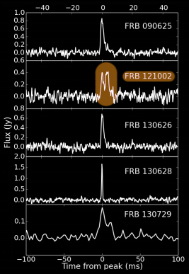 I cinque nuovi FRB descritti nel paper. In evidenza, FRB 121002, quello con il doppio impulso. Fonte: http://arxiv.org/abs/1511.07746