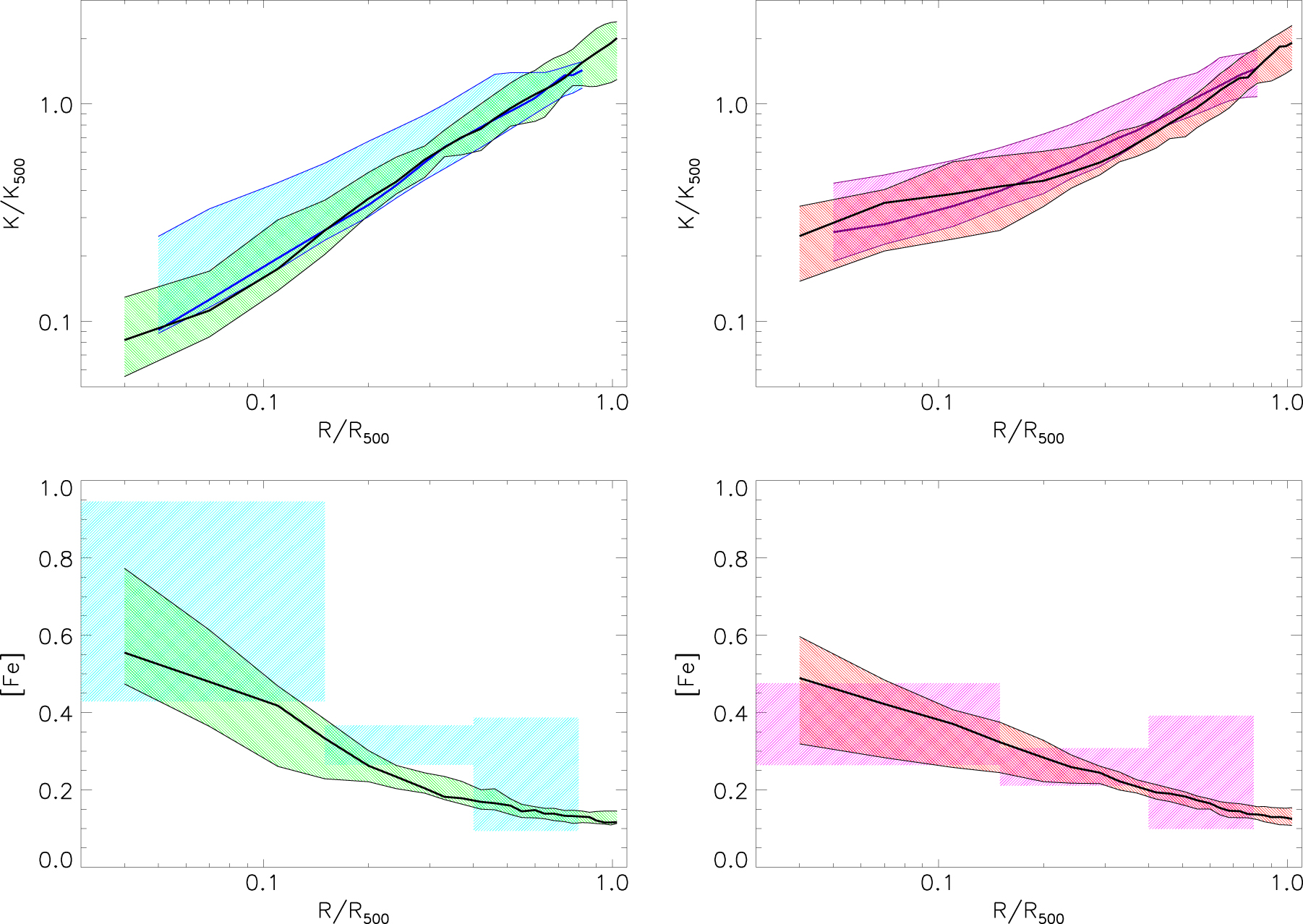 Confronto tra i risultati teorici per i Cool Clusters, in verde, e per i Non-Cool Clusters, in rosso, e i profili ricavati dei dati della banda X ottenuti dai satelliti Chandra e XMM-Newton. L’analisi dei dati è di Pratt et al. 2010, A&A, 511, A85 ed Ettori et al. 2015, A&A, 578, A46