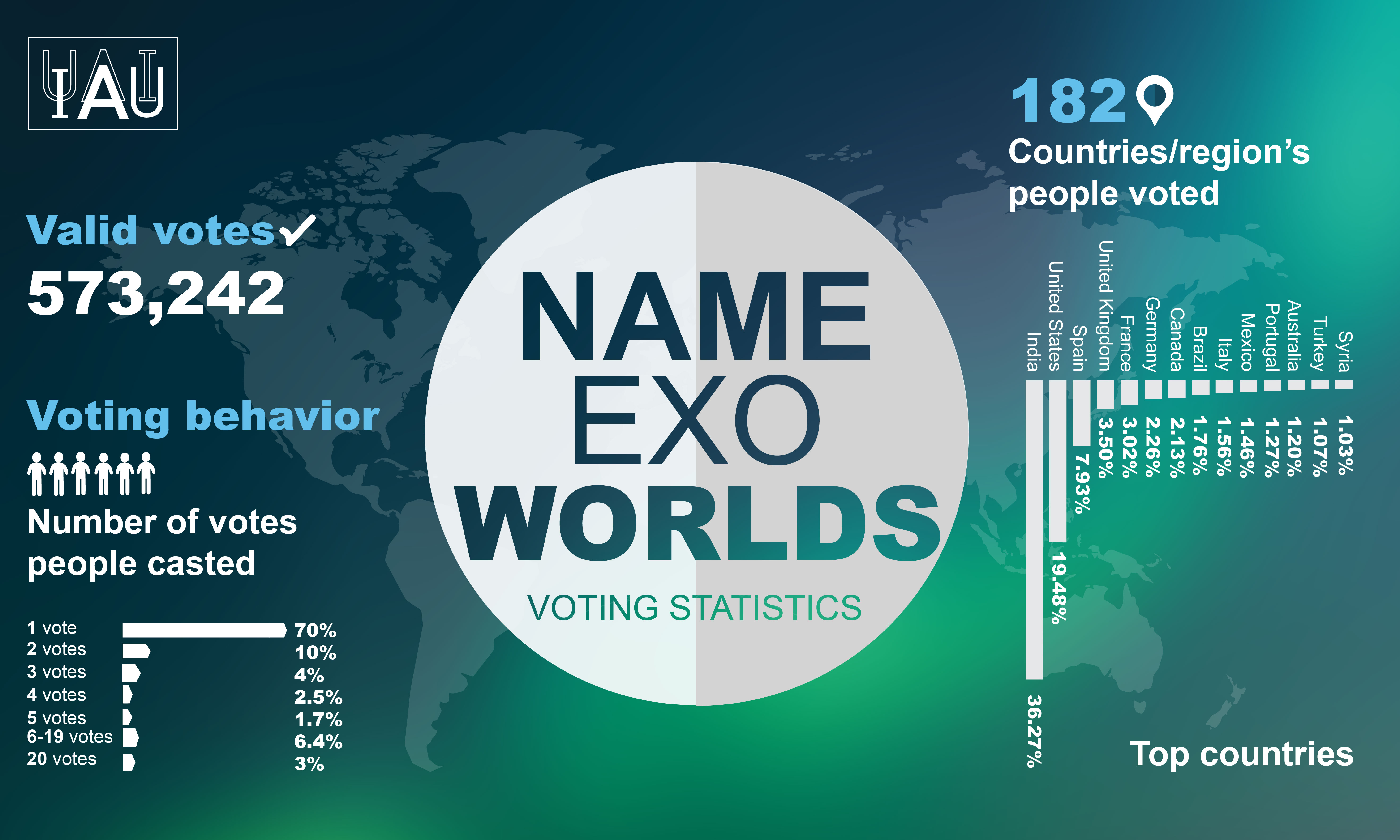 Le statistiche raccolte da IAU relative al Concorso NameExoWorlds mostrano che il 70 per cento dei votanti ha dato una sola preferenza per i 20 sistemi planetari, mentre il 6,4 per cento ha votato tra 6 e 19 exoworlds. L’India è stata il paese col maggior numero di votazioni (36%), seguita da Stati Uniti (19,5%) e Spagna (8%). L’Italia si colloca al nono posto (1.56%). Crediti: IAU