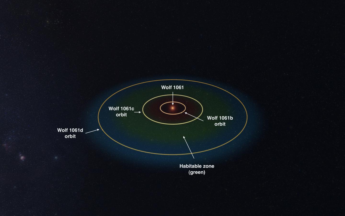 Il sistema della nana rossa Wolf 1061. Crediti: immagine realizzata con il programma Universe Sandbox 2