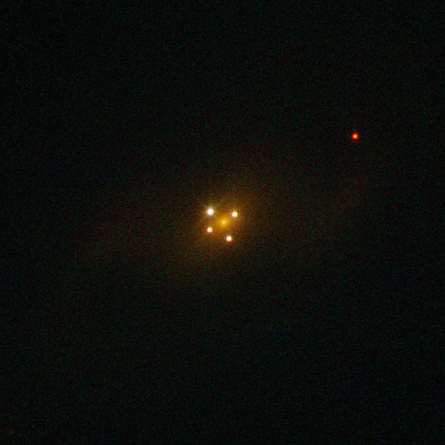 Gli astronomi lo hanno ribattezzato ‘Croce di Einstein’ per il fatto che la sua immagine ci appare “clonata” quattro volte, a formare le estremità di una ipotetica croce. Il quasar Q2237-0305, distante circa 8 miliardi di anni luce da noi, ci appare così a causa dell’effetto di lente gravitazionale esercitato da una galassia assai più vicina – a circa 400 milioni di anni luce dalla Terra – che si trova esattamente tra noi ed esso, splendida conferma delle predizioni della Teoria della Relatività Generale formulata giusto un secolo fa da Albert Einstein. Ora, un gruppo di ricerca spagnolo è riuscito ad ottenere le più accurate misure della regione interna appartenente al disco di materia in rotazione proprio attorno al buco nero supermassiccio che alimenta l’immane flusso di radiazione emessa da Q2237-0305.