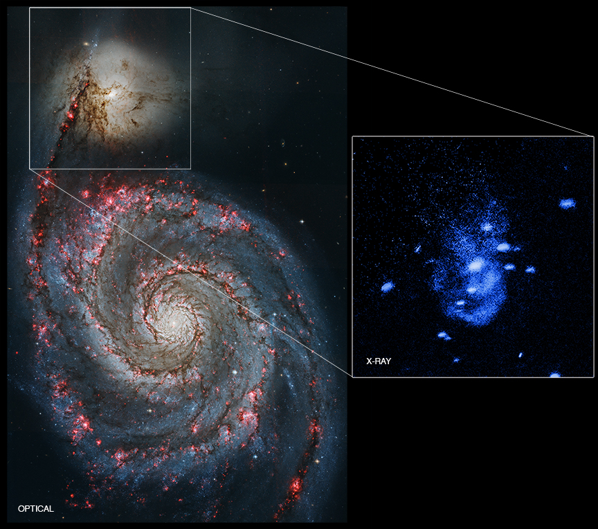L’immagine principale mostra il sistema Messier 51 osservato in luce visibile dal telescopio spaziale Hubble. Nell’inserto il campo di vista che include la galassia NGC 5195 vista dal telescopio a raggi X Chandra (in blu). Un team di ricercatori ha scoperto la presenza di due archi vicino al centro della galassia, che sono stati prodotti molto probabilmente da due violente esplosioni del buco nero supermassiccio di NGC 5195. Crediti: raggi X: NASA/CXC/Univ of Texas/E.Schlegel et al; Ottico: NASA/STScI