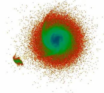Queste immagini della Via Lattea mostrano la simulazione della distribuzione del gas, a sinistra, rispetto alla distribuzione delle stelle, a destra, una volta che la galassia nana perturba la galassia. Credit: Sukanya Chakrabarti/Rochester Institute of Technology