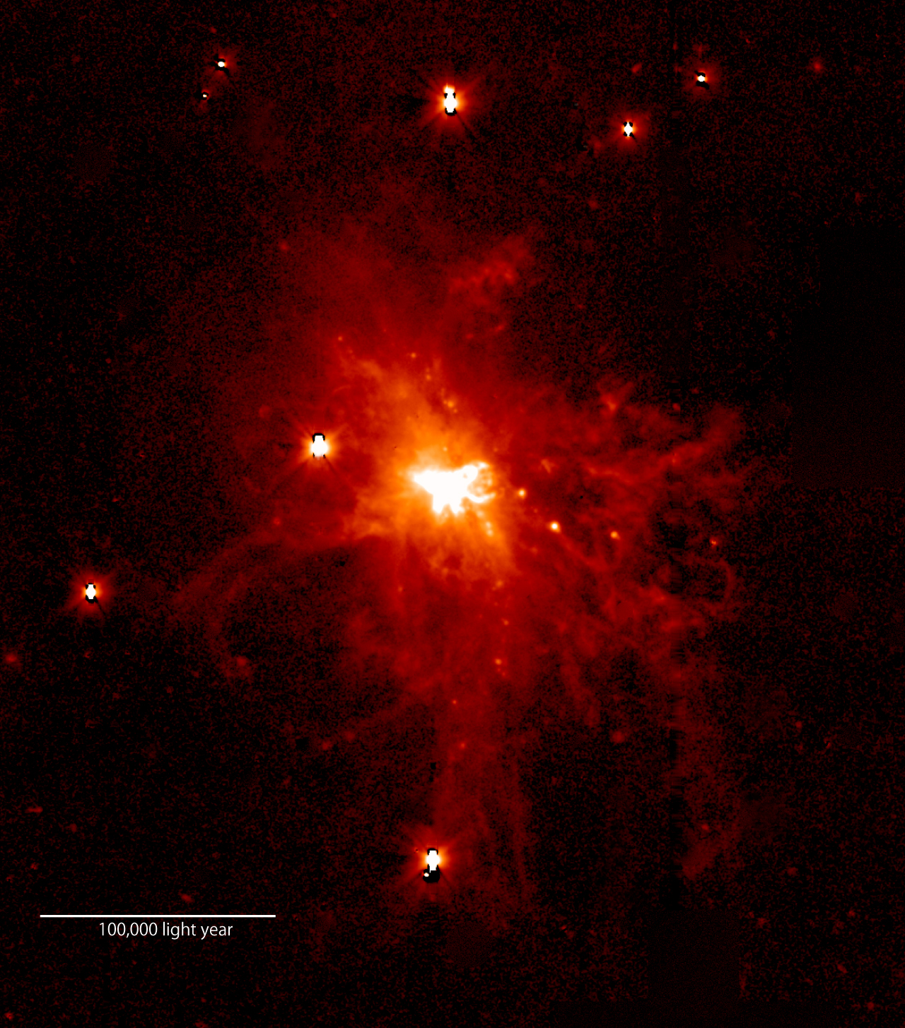 La gigantesca nebulosa di gas ionizzato, detta nebulosa H-alfa, che circonda NGC 6240. Questa immagine è stata ottenuta sottraendo la radiazione stellare continua dall’immagine H-alfa ed estraendo l’emissione netta in H-alfa. La complessa struttura a filamenti si estende su centinaia di migliaia di anni luce. Crediti: Hiroshima University / NAOJ