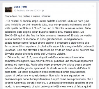 «In realtà il post è nato come privato, cioè solo per i miei contatti Facebook, perché avevo visto sulla mia bacheca qualche contatto che se n’era uscito con le solite affermazioni del tipo “Vabbé, ma si spendono soldi per queste cose che non servono a nessuno, ma poi i bambini in Africa che fine fanno? Perché non investiamo i soldi in maniera migliore?”. Era una cosa che già mi aspettavo, perché avviene a ogni scoperta scientifica, ma questa volta queste lamentele erano numerose, visto l’impatto mediatico abbastanza importante che la scoperta delle onde gravitazionali ha avuto. Allora ho deciso di fare questo post privato, un po’ polemico, in modo tale da rispondere alle domande sul perché un certo argomento ci interessa.»