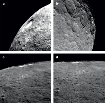 Immagini del cratere Occator (92 km di diametro). Il cratere è coperto da materiale luminoso che mostra un ciclo diurno: a mezzogiorno (a) è riempito da una diffusa foschia. Questa foschia scompare completamente al crepuscolo (b). Nelle viste radenti (c) e (d) si può vedere come la foschia rimanga confinata dentro il cratere e non si estenda nella parte sud-occidentale al di sopra della parte elevata del cratere. Crediti: Nathues et al., Nature, 2015