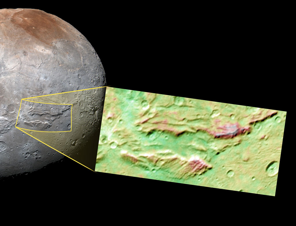 Il riquadro superiore dell’immagine rilasciata dal team di New Horizons mostra una porzione (386 x 175 km) della regione informalmente chiamata “Serenity Chasma”, parte di una vasta fascia equatoriale di voragini su Caronte. Il riquadro inferiore mostra la stessa zona in falsi colori, che ne evidenziano la topografia.