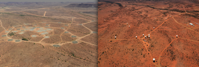 Viste aeree delle antenne MeerKAT in Sudafrica a sinistra e ASKAP in Australia a destra. Si tratta di antenne parte del network SKA. Crediti: SKA SA e CSIRO