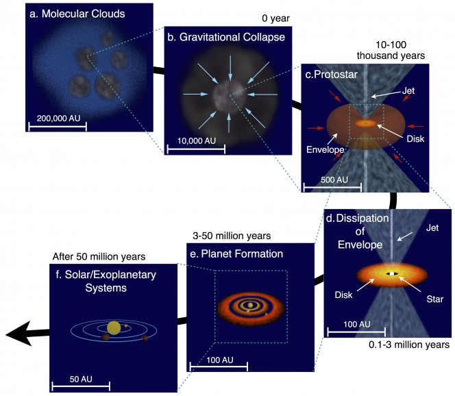 La formazione planetaria avviene quando materiale circostante cade all’interno di stelle giovani e molto attive, che si nutrono voracemente – appunto – della polvere e del gas che le circonda, anche se rimangono nascoste all’interno delle loro nuvole di nascita.