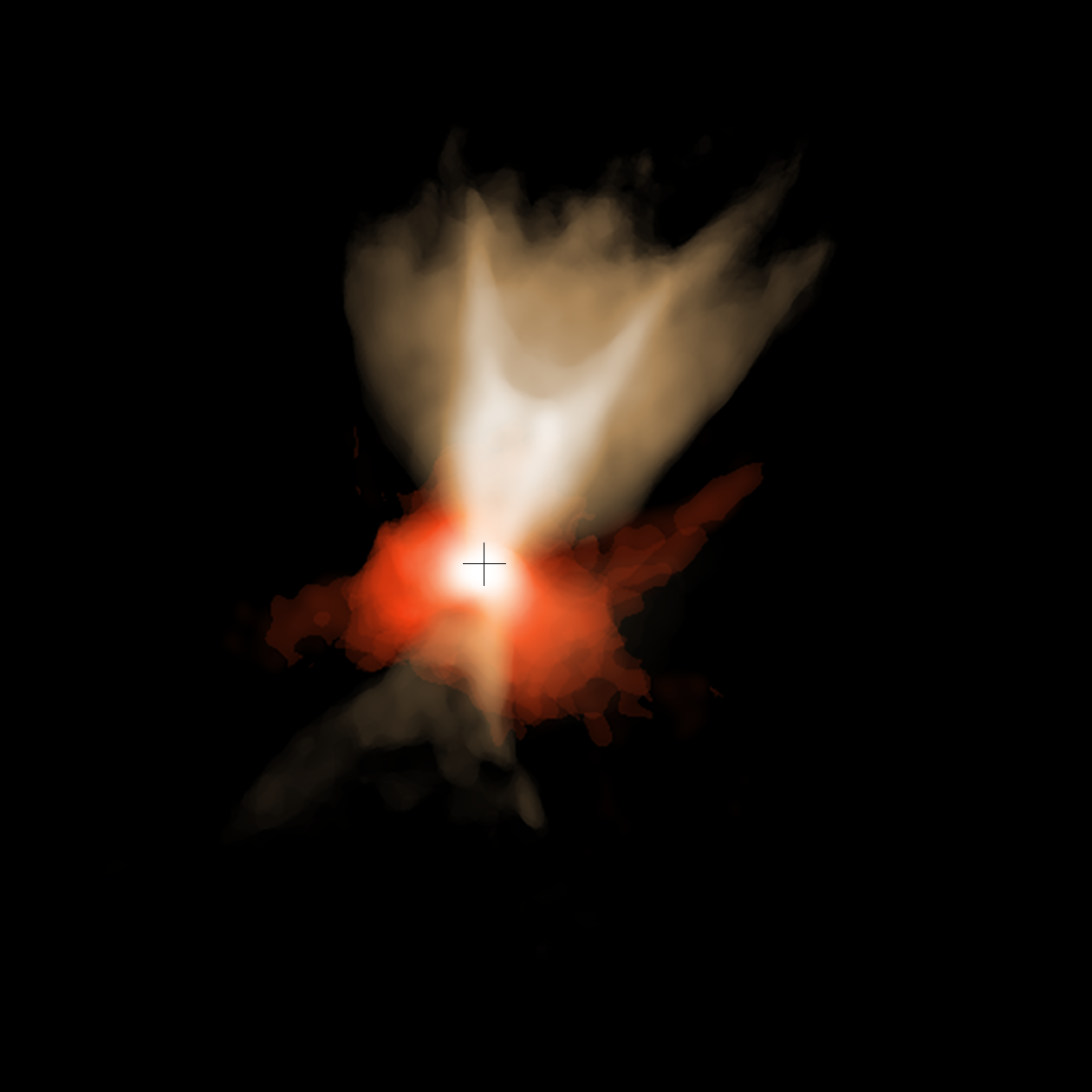 Il denso strato di gas osservato attorno alla stella con ALMA è mostrato in rosso. Il gas è mostrato in bianco. La posizione della stella è indicata con una croce. Crediti: ALMA (ESO/NAOJ/NRAO), Aso et al.