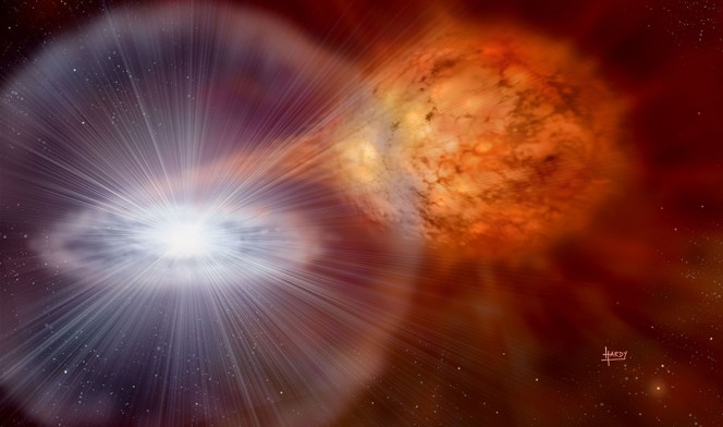 Rappresentazione artistica di una nova. Gli esperti della MSU stanno lavorando per determinare se la polvere proveniente da questa esplosione sia arrivata fino alla Terra. Crediti: David Hardy