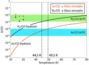 Lo strumento ROSINA, utilizzato per sondare la natura del ghiaccio della cometa, è uno spettrometro di massa che ha raccolto informazioni circa le abbondanze di azoto molecolare (N2), monossido di carbonio (CO) e argon (Ar) nel ghiaccio cometario. I dati sono stati confrontati con quelli provenienti da esperimenti di laboratorio su ghiaccio amorfo, e successivamente con modelli che descrivono la composizione degli idrati gassosi, un tipo di ghiaccio cristallino in cui le molecole d’acqua possono intrappolare quelle di alcuni gas. I rapporti N2 e CO e tra Ar a CO osservati sulla cometa 67P corrispondono a quelli trovati nel modello degli idrati gassosi, e la quantità di argon è cento volte inferiore a quella che può essere intrappolata nel ghiaccio amorfo. Il ghiaccio presente sulla cometa 67P ha quindi senza dubbio una struttura cristallina.