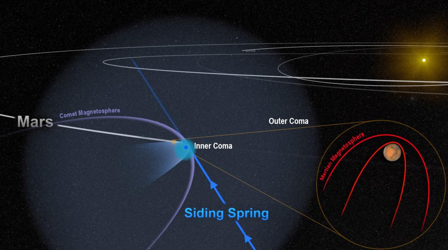 L’incontro ravvicinato tra la cometa Siding Spring e Marte ha sferzato il pianeta con minuscoli ma velocissimi frammenti di polvere della chioma – pallottole vaganti a 56 km al secondo. Il potente campo magnetico della cometa si è temporaneamente fuso con quello più debole di Marte. Crediti: NASA/Goddard
