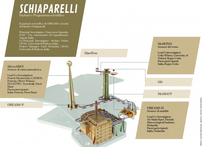 A bordo di ExoMars, protetto dalla robusta “armatura” del lander Schiaparelli, ecco lo strumento DREAMS (Dust Characterization, Risk Assessment and Environment Analyser on the Martian Surface): una suite di sensori per la misura dei parametri meteorologici e del campo elettrico atmosferico in prossimità della superficie di Marte, frutto della collaborazione fra l’INAF – Osservatorio Astronomico di Napoli, l’Agenzia Spaziale Italiana e il CISAS di Padova. Lo osserviamo da vicino grazie all’infografica che Media INAF ha realizzato in occasione del lancio della missione ESA.
