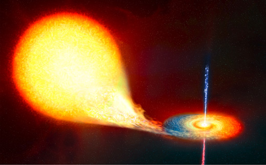 Rappresentazione artistica di un sistema binario come V404 Cygni, formato da un buco nero che strappa materiale da una stella compagna. Crediti: ESA