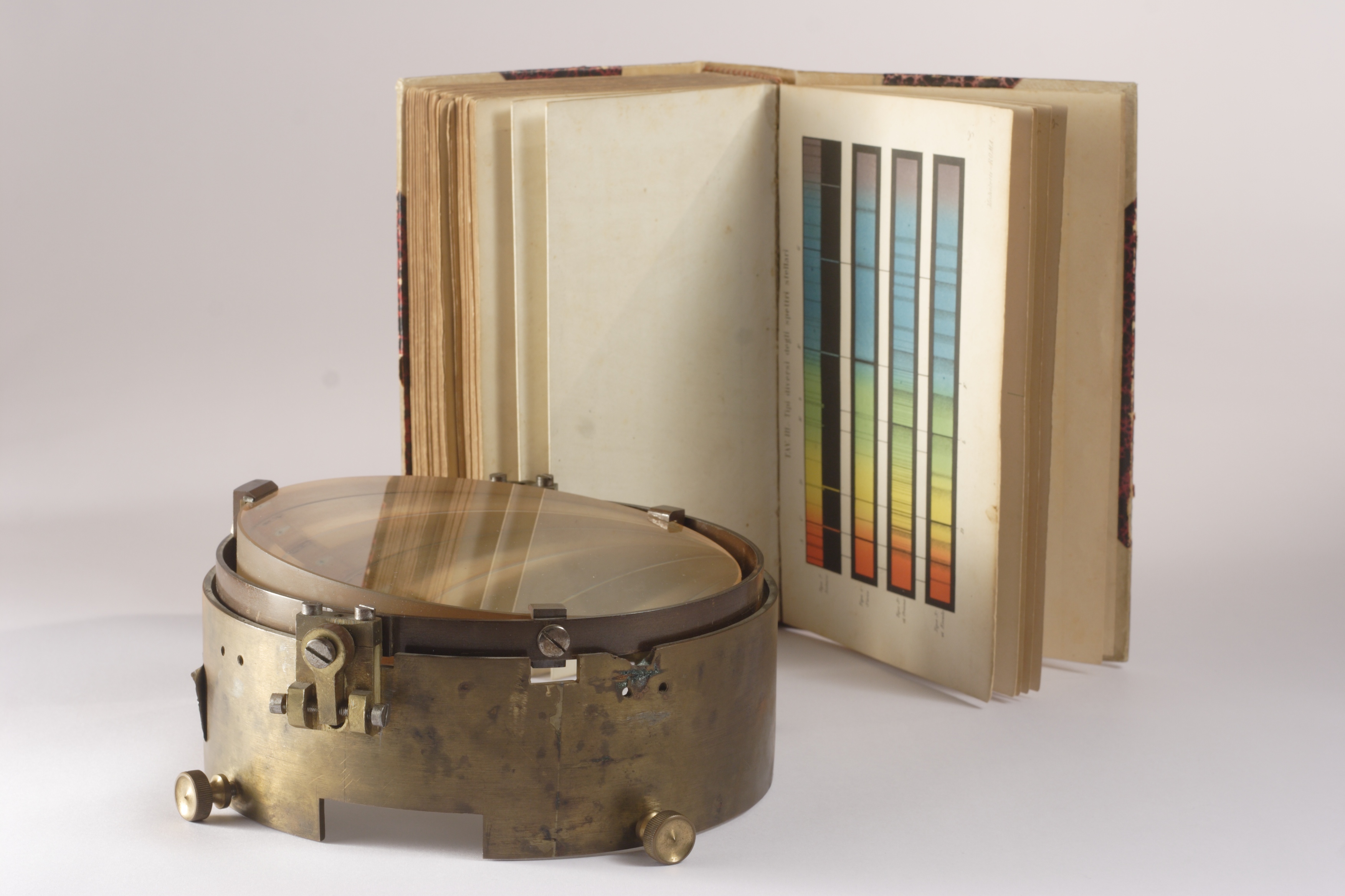 La classificazione spettrale da “Le stelle” di Angelo Secchi e il prisma obiettivo usato da Merz, tra le tante opere in mostra in occasione di Starlight. La foto è anche la copertina del catalogo.