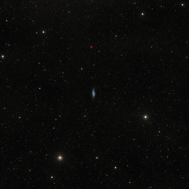 Questa panoramica mostra il cielo intorno alla galassia nana WLM nella costellazione della Balena. L’immagine è stata prodotta a partire dai dati della DSS 2 (Digitized Sky Survey 2). La galassia si mostra al centro della fotografia come un mucchietto irregolare di stelle poco luminose. Crediti: