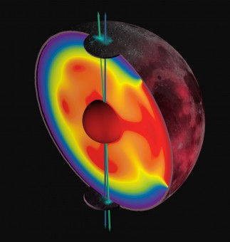 Nell’immagine, una sezione trasversale della Luna che mette in evidenza lo spostamento dei poli, da quelli del passato (in rosso) a quelli attuali (in blu). Il riarrangiamento delle masse interne al nostro satellite sembra dovuto alla formazione ed evoluzione della regione chiamata Procellarum, associata a grandi abbondanze di elementi radioattivi. Crediti: James Keane, U. of Arizona