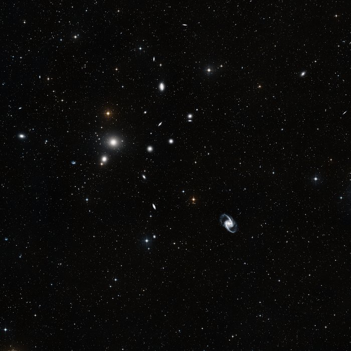 In basso a destra nell’immagine si vede la grande spirale barrata NGC 1365, un rappresentante suggestivo della sua classe, con la barra molto evidente che passa proprio per il centro della galassia e i bracci a spirale che emergono dalle estremità della barra. In accordo con la natura delle galassie d’ammasso, c’è più di quel che appare in NGC 1365. È infatti classificata come galassia di Seyfert per via di un nucleo attivo brillante che contiene un buco nero supermassiccio.