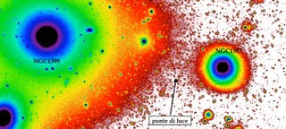 Ingrandimento della regione dell’ammasso della Fornace tra la galassia cD NGC1399 (a sinistra) e la galassia NGC1387 (a destra) osservata con il VST. In quest’area si apprezza un struttura filamentare di luce che collega le due galassie, costituita da stelle, ammassi globulari e galassie nane strappate via dalle regioni più esterne di NGC1387 sotto l’attrazione gravitazionale esercitata da NGC1399. L’immagine è in falsi colori, in cui le intensità decrescono dal nero al rosso. Crediti: E. Iodice, INAF-Oa Capodimonte