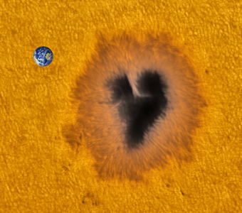 La macchia solare AR2529 fotografata il 13 aprile 2016, confrontata alle dimensioni della Terra. Crediti: Karzaman Ahmad, Langkawi National Observatory in Malaysia