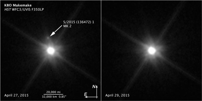 Due immagini acquisite dalla Wide Field Camera 3 a bordo di Hubble, rispettivamente il 27 aprile 2015 (pannello a sinistra) e il 29 aprile 2015 (a destra). Nel primo è possibile individuare, indicato dalla freccia, il satellite di Makemake. Crediti: NASA, ESA, A. Parker e M. Buie (Southwest Research Institute), W. Grundy (Lowell Observatory) e K. Noll (NASA Goddard Space Flight Center)