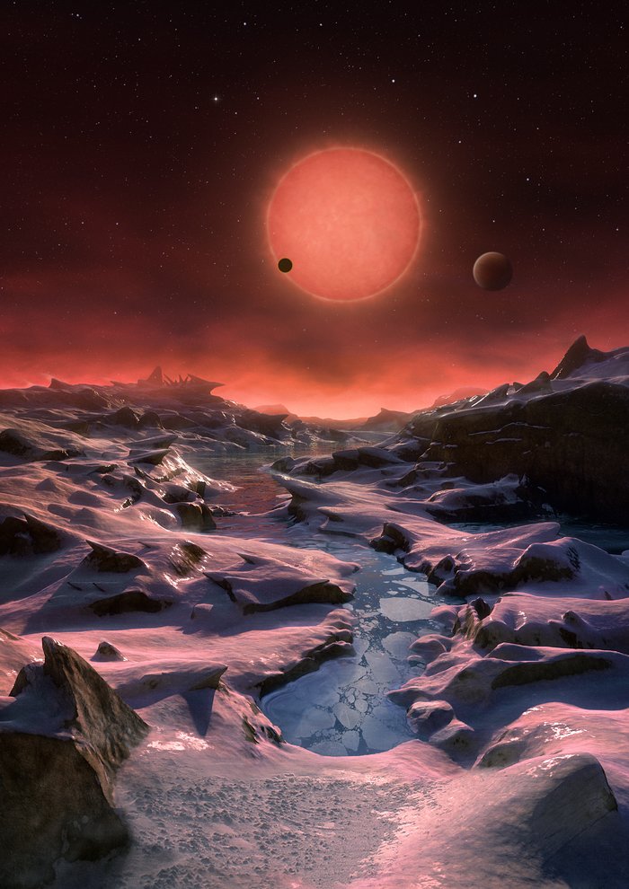 Un immaginario panorama dalla superficie di uno dei tre pianeti in orbita intorno a una stella nana ultra-fredda a soli 40 anni luce dalla Terra, scoperti dal telescopio TRAPPIST all’Osservatorio dell’ESO a La Silla. In questa veduta uno dei pianeti interni sta transitando di fronte al disco della sua stella madre, minuscola e poco luminosa. Crediti: ESO/M. Kornmesser