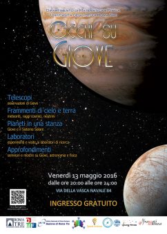 Osservare Giove al telescopio è solo una fra le attività in programma a Roma per la sera di venerdì 13 maggio. Dalle ore 20 fino a mezzanotte, chi si recherà presso i locali del Dipartimento di matematica e fisica dell’Università Roma Tre (in via della Vasca Navale 84, a Roma) incontrerà studenti e ricercatori pronti a guidare il pubblico alla scoperta della fisica e dell’astronomia con esperimenti, laboratori, dimostrazioni scientifiche, spettacoli, conferenze e seminari divulgativi.