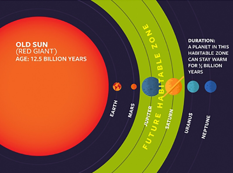 In base alla massa originale della stella, lune e pianeti possono aggirarsi lungo la fascia abitabile d’una gigante rossa anche per 9 miliardi di anni. La Terra, per esempio, risiede in zona abitabile da circa 4,5 miliardi di anni, durante i quali ha brulicato in essa ogni possibile forma di vita. Ma nel giro di qualche miliardo di anni il Sole diventerà anch’esso una gigante rossa, inghiottendo Mercurio e Venere, trasformando la Terra e Marte in pianeti rocciosi sfrigolanti, e scaldando quei mondi lontani – come Giove, Saturno, Nettuno e le loro lune – che verranno a trovarsi in quella che sarà la nuova zona abitabile.