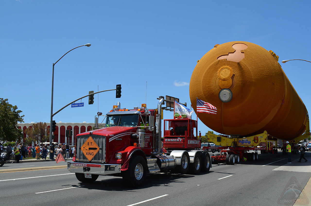 Ma gli Stati Uniti non restano a guardare, o almeno cercano di celebrare finché possono ciò che resta degli Shuttle della NASA. Sabato scorso l’ET-94 (l’ultimo External Tank certificato per il volo nello spazio) ha sfilato per le strade di Los Angeles (acclamato come una star di Hollywood) nel suo ultimo viaggio prima di essere esposto a partire dal 2018 presso il Samuel Oschin Air and Space Center. La NASA ha deciso infatti di donare questo “pezzo di storia” al California Science Center, come è successo nel 2012 con l’orbiter Endavour (il cui spostamento ciclopico ha avuto un grande impatto sulle strutture stradali della città). L’enorme serbatoio (lungo 47 metri e largo 10) ha percorso 26 chilometri per le strade di Los Angeles. Chi ha assistito alla “parata” ha affermato che le difficoltà maggiori ci sono state alle curve… beh, provateci voi a guidare un aggeggio simile!