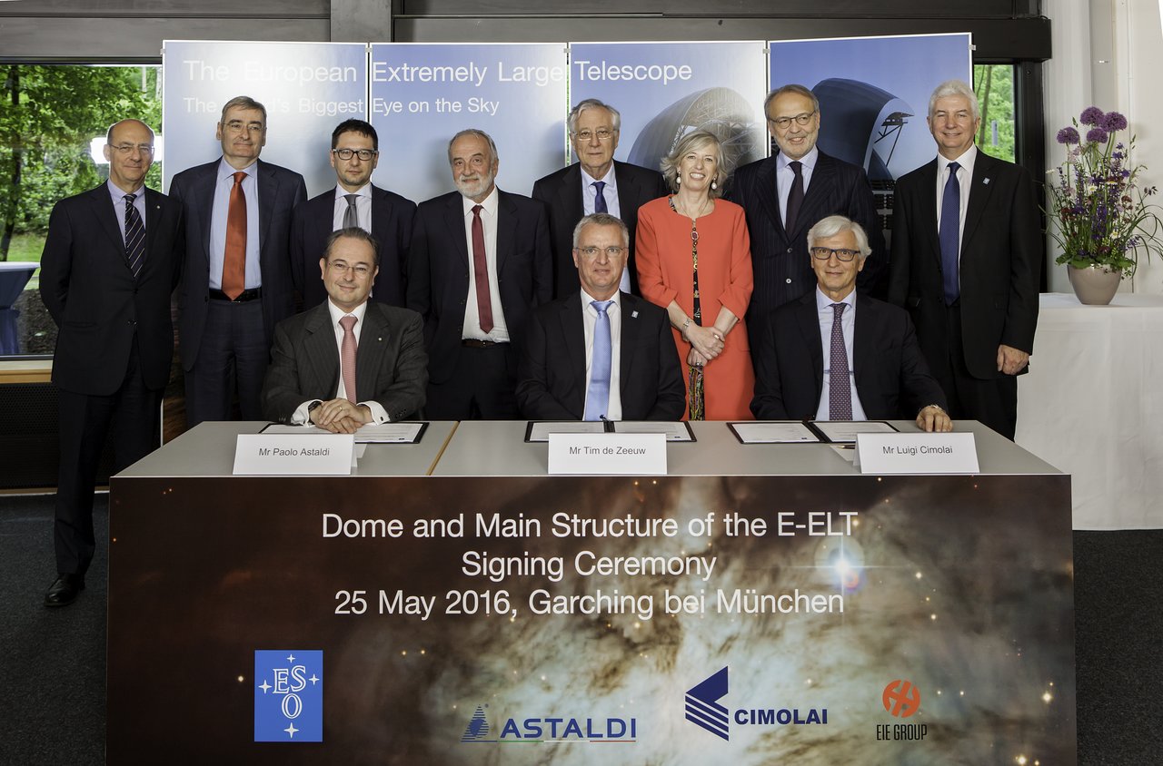 Il contratto è stato siglato dal Direttore Generale di ESO Tim de Zeeuw, dal presidente di Astaldi, Paolo Astaldi e dal presidente di Cimolai, Luigi Cimolai. Alla cerimonia della firma erano presenti il Ministro dell’Istruzione, Università e della Ricerca, On. Stefania Giannini, il Console Generale d’Italia a Monaco Renato Cianfrani, il presidente del Council di ESO Patrick Roche e i delegati italiani al Council di ESO, ovvero il Presidente dell’Istituto Nazionale di Astrofisica, Nicolò D’Amico, e Matteo Pardo, Addetto scientifico presso l’Ambasciata Italiana a Berlino, oltre al presidente di EIE Gianpiero Marchiori e altri rappresentanti del consorzio.