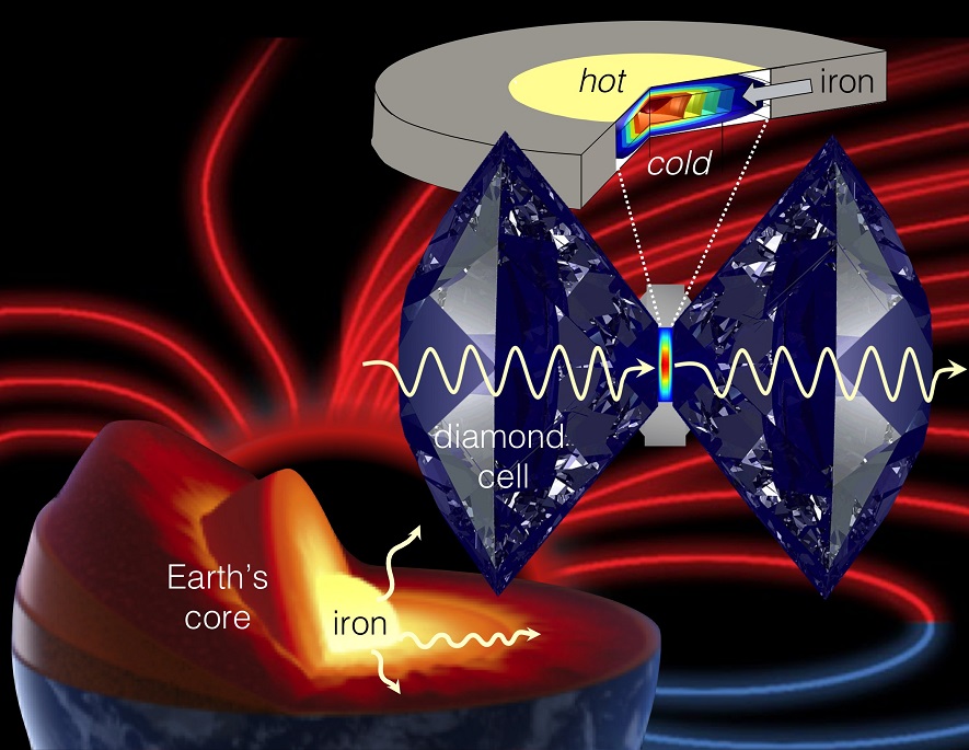 Sappiamo che il nostro pianeta si è “assemblato” aggregando via via materiale roccioso che circondava il giovane Sole e, con il trascorrere del tempo, gli elementi più pesanti presenti in questi mattoni primordiali, in particolare il ferro, sono sprofondati fin verso le zone più interne, stratificandosi fino a raggiungere la configurazione attuale, con un nucleo interno, un mantello intermedio e una crosta esterna. La regione più interna del nucleo terrestre è solida, mentre quella esterna è composta da uno strato fuso di lega di ferro che, ruotando e sfregando sulla parte solida, genera appunto il campo magnetico. Queste informazioni però non bastano per riuscire a ricostruire altrettanto accuratamente il comportamento del campo magnetico terrestre nel tempo, che è legato alla conoscenza di alcuni parametri delle regioni centrali del nostro pianeta, come la composizione chimica del nucleo, la pressione, la temperatura e le proprietà con cui si propaga il calore al suo interno. Ed è proprio sullo studio della propagazione del calore tra gli strati solidi e liquidi del nucleo della terra che Alexander Goncharov del Carnegie Institute e il suo team hanno condotto una serie di esperimenti di laboratorio, per ricavare informazioni su come il nostro campo magnetico si è sviluppato e quanta energia viene spesa per sostenere la sua intensità.