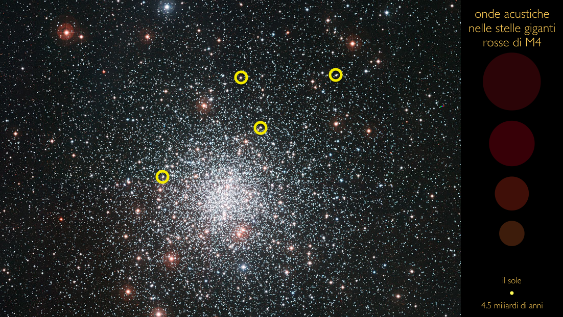 L'immagine mostra l'ammasso stellare globulare M4 e la posizione nel cielo di alcune delle stelle all'interno delle quali sono state identificate oscillazioni acustiche. Cliccare sull'immagine per aprire la pagina web interattiva dove, posizionando il cursore all'interno dei cerchietti gialli, è possibile ascoltare il suono caratteristico delle oscillazioni globali degli astri. Le frequenze dei suoni sono state aumentate di 10 milioni di volte per renderle udibili all'orecchio umano. Mantenendo lo stesso fattore moltiplicativo, le oscillazioni acustiche del Sole sarebbero così elevate da cadere nel dominio degli ultrasuoni. Sulla colonna di destra sono riportate le dimensioni relative delle stelle analizzate, gliganti rosse con raggi tra le 8 e le 16 volte quelli del nostro Sole. Crediti: A. Miglio, ESO