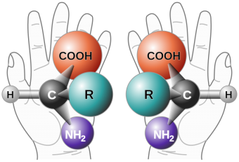 Le due diverse chiralità di un amminoacido, e per somiglianza quelle di due mani. La parola chiralità deriva dal greco, e significa appunto “mano”. Crediti: Wikipedia