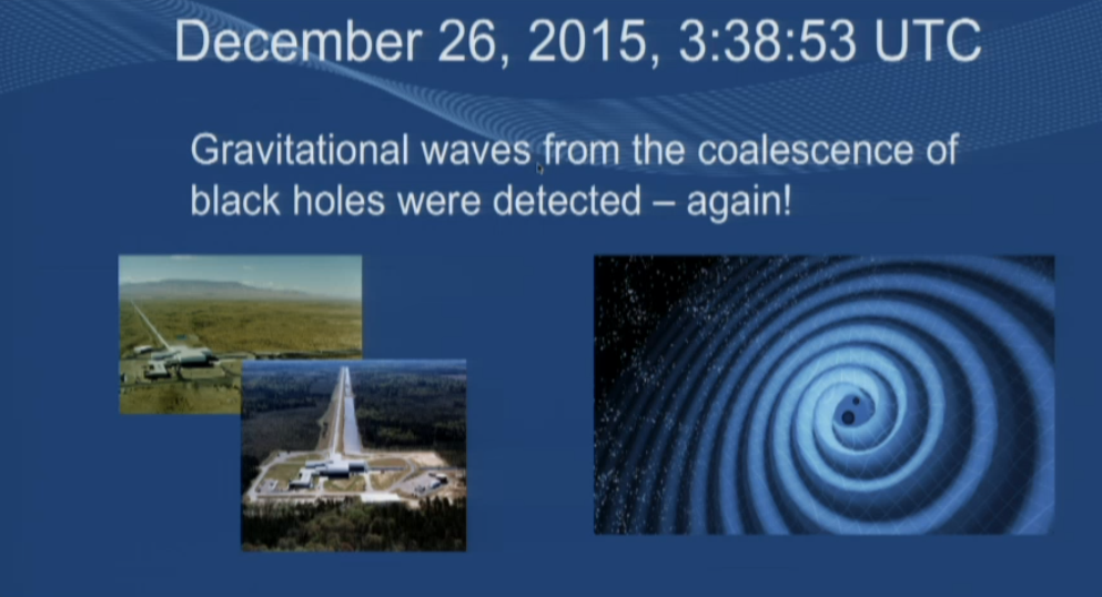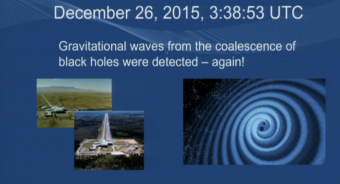Onde gravitazionali, ecco il bis. Nella notte fra il 25 e il 26 dicembre scorso, a distanza di tre mesi e 12 giorni dopo l’evento – ormai storico – del 14 settembre 2015 – gli interferometri LIGO di Livingston e Hanford, negli Stati Uniti, hanno captato un nuovo segnale prodotto dal passaggio di un’onda gravitazionale. L’hanno appena annunciato in conferenza stampa internazionale, durante il meeting dell’American Astronomical Society a San Diego (in California), gli scienziati della collaborazione LIGO e VIRGO (interferometro quest’ultimo situato a Cascina, in provincia di Pisa, un progetto congiunto tra INFN e CNRS).