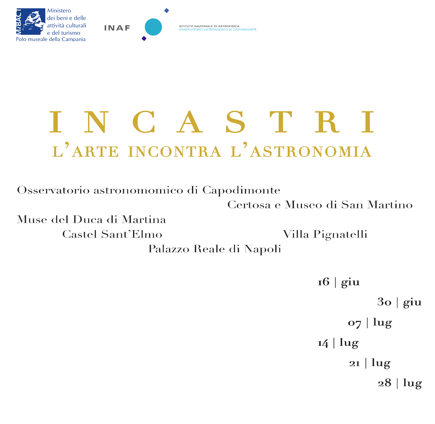 IncAstri propone una serie di sei conversazioni di arte e di astronomia per favorire la diffusione della cultura scientifica e la valorizzazione delle collezioni museali che espongono alcuni preziosi oggetti d’arte strettamente legati all’astronomia del passato e alla moderna ricerca scientifica. «Anche per quest’anno il Polo museale della Campania – spiega Mariella Utili, direttrice del Polo museale della Campania – propone, per il periodo estivo, iniziative e percorsi nei musei, per far conoscere la ricchezza del patrimonio e delle collezioni dei musei di Napoli. Partendo dagli astrolabi della Sezione navale della Certosa di San Martino, impiegati per calcolare la posizione dei corpi celesti, alle scatole ottiche e alle preziose ceramiche con decori astronomici del Museo Duca di Martina, dal telescopio della collezione della principessa Pignatelli ai celebri orologi ottocenteschi con planetario e figura di Atlante conservati a Palazzo Reale, ci si addentrerà nelle suggestioni del cosmo, nei mille misteri che custodisce e che gli studi in corso contribuiscono a chiarire. Un modo suggestivo, dunque, per approfondire la conoscenza dell’Universo, di pomeriggio, al museo».