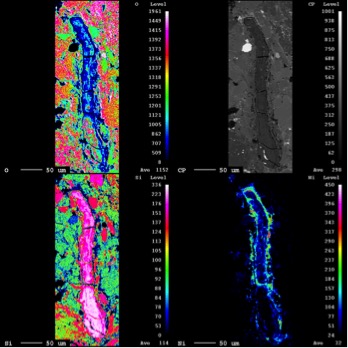 Immagini di uno dei tanti pezzi di opale trovati nel meteorite EET 83309. In senso orario, a partire da in alto a sinistra: concentrazioni di ossigeno nell’opale e nei minerali circostanti; al microscopio elettronico (l’oggetto scuro lungo e sottile è opale); concentrazioni di nichel; concentrazioni di silicio. Crediti: H. Downes