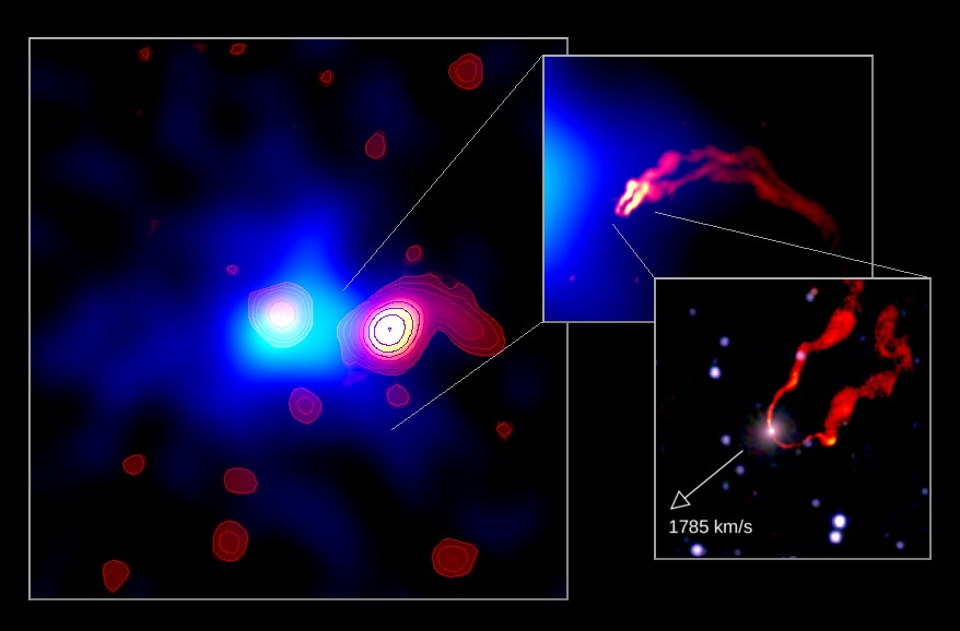 Il buco nero domina il nucleo di una galassia ellittica distante circa 300 milioni di anni luce dalla Terra. La coppia si trova in “rotta di collisione” con un vicino ammasso di galassie, trascinata dalla forza di gravità generata dalla imponente concentrazione di materia oscura, galassie e gas caldo. Le immagini radio rivelano che il buco nero sta attivamente accrescendo materia dal mezzo circostante. Parte di questo materiale non precipita nel buco nero ma viene espulsa lungo due getti di plasma, formando una spettacolare scia radio molto più lunga ed estesa della stessa galassia.