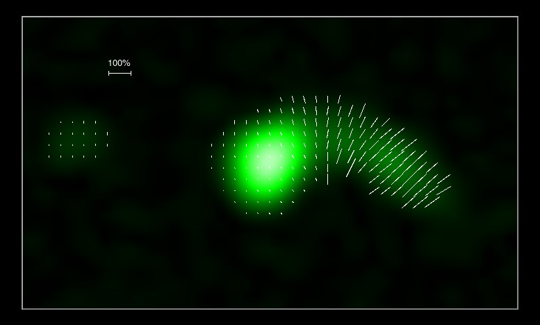 Immagine di 3C129 in luce polarizzata ottenuta con SRT a 6.6 GHz. La lunghezza dei segmenti in bianco è proporzionale alla percentuale di polarizzazione mentre il loro orientamento rappresenta l’angolo di polarizzazione delle onde radio
