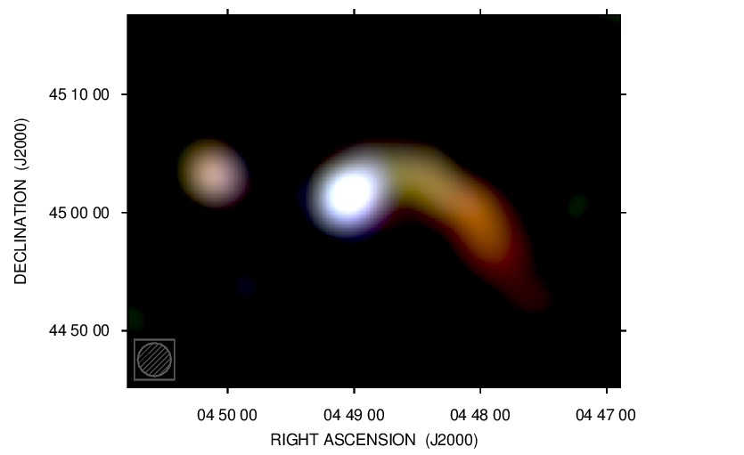Composizione multicolore di 3C129 ottenuta da una combinazione di tre esposizioni in banda radio: 0.3 GHz (Westerbork Synthesis Radio Telescope; rosso), 1.4 GHz (Very Large Array; verde) e 6.6 GHz (SRT; blu). Si noti come il tono del colore cambi gradatamente dal blu al rossastro a causa dell’intenso raffreddamento radiativo del plasma radio emittente
