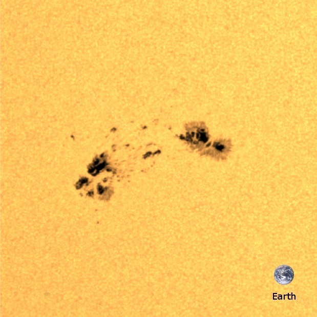 Una regione solare attiva vista dallo strumento HMI a bordo della sonda SDO della NASA. Le regioni più scure sono macchie solari, e corrispondono a zone in cui il campo magnetico della stella è più intenso. L’immagine della Terra è sovrapposta per confronto delle dimensioni. Crediti: MPS