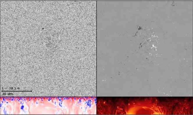 Simulazione del sorgere di una concentrazione di flusso magnetico attraverso gli ultimi 18.000 km della superficie solare. Mentre la concentrazione del flusso sale verso la superficie, interagisce con la convezione. Nel pannello a sinistra in alto è mostrata la luminosità superficiale e in quello a destra, sempre in alto, i dati relativi al campo magnetico superficiale verticale (in bianco e nero i campi magnetici verticali di polarità opposta). Nel pannello a sinistra in basso è rappresentata la velocità verticale dei flussi simulati (in rosso i flussi in salita e in blu quelli verso il basso), mentre nel pannello in basso a destra una visione verticale del campo magnetico (in rosso scuro i campi più intensi, in giallo quelli deboli). Crediti: Matthias Rempel/High Altitude Observatory, National Center for Atmospheric Research