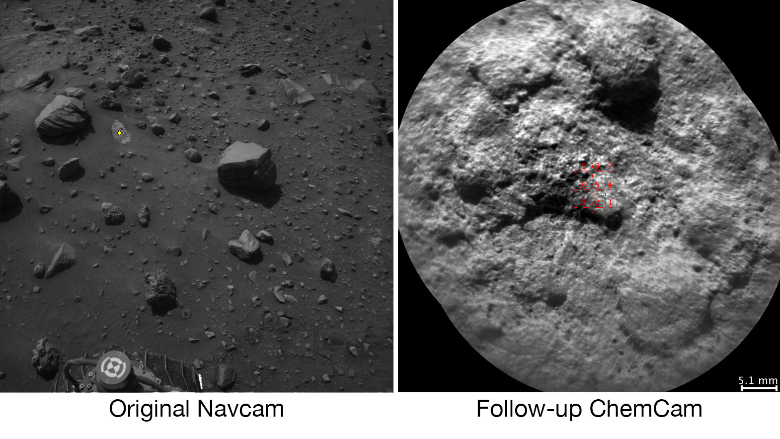 Il rover Curiosity è in grado di selezionare automaticamente quali sono gli obiettivi della camera telescopica laser del suo strumento ChemCam. Ad esempio, un software analizza l’immagine ripresa da NavCam (quella a sinistra), sceglie l’obiettivo indicato (punto giallo a sinistra), e indica a ChemCam dove analizzare (puntini rossi a destra). Crediti: NASA/JPL-Caltech/LANL/CNES/IRAP/LPGNantes/CNRS/IAS
