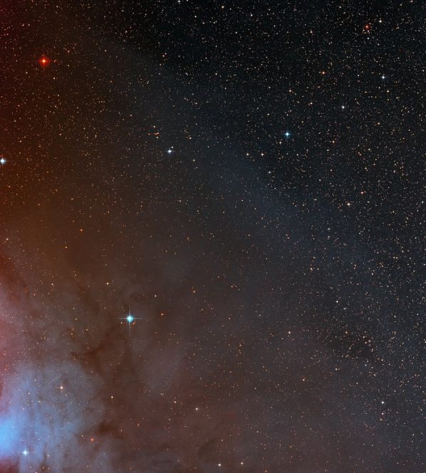 Questa panoramica derivata dalla DSS2 (Digitized Sky Survey 2) mostra il ricco sfondo di stelle che circonda l’insolito sistema binario AR Scorpii. Crediti: Digitized Sky Survey 2. Acknowledgement: Davide De Martin