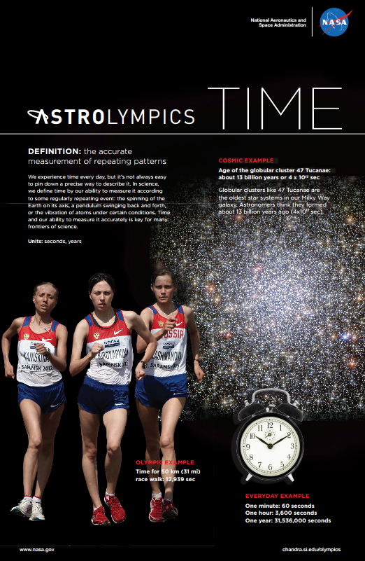 Lo sport e la scienza, quindi, legati più che mai da “semplici” leggi della fisica che governano anche la nostra vita quotidiana. E allora perché non conoscerle meglio godendo anche delle immagini più belle mai raccolte nello spazio dai telescopi spaziali? Con AstrOlympics si cerca di spiegare in parole semplici i concetti della fisica, confrontandoli poi con esperienze della vita di tutti i giorni, come ad esempio la centrifuga della lavatrice, i limiti di velocità sulle nostre strade, il peso del corpo sulla Terra, la distanza da percorrere da un punto all’altro del pianeta o il tempo che scorre nei nostri orologi.