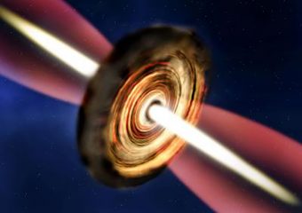 Rappresentazione artistica della stella massiccia, del disco kepleriano chela circonda e del getto da essa prodotto. Crediti: A. Smith, Institute of Astronomy, Cambridge