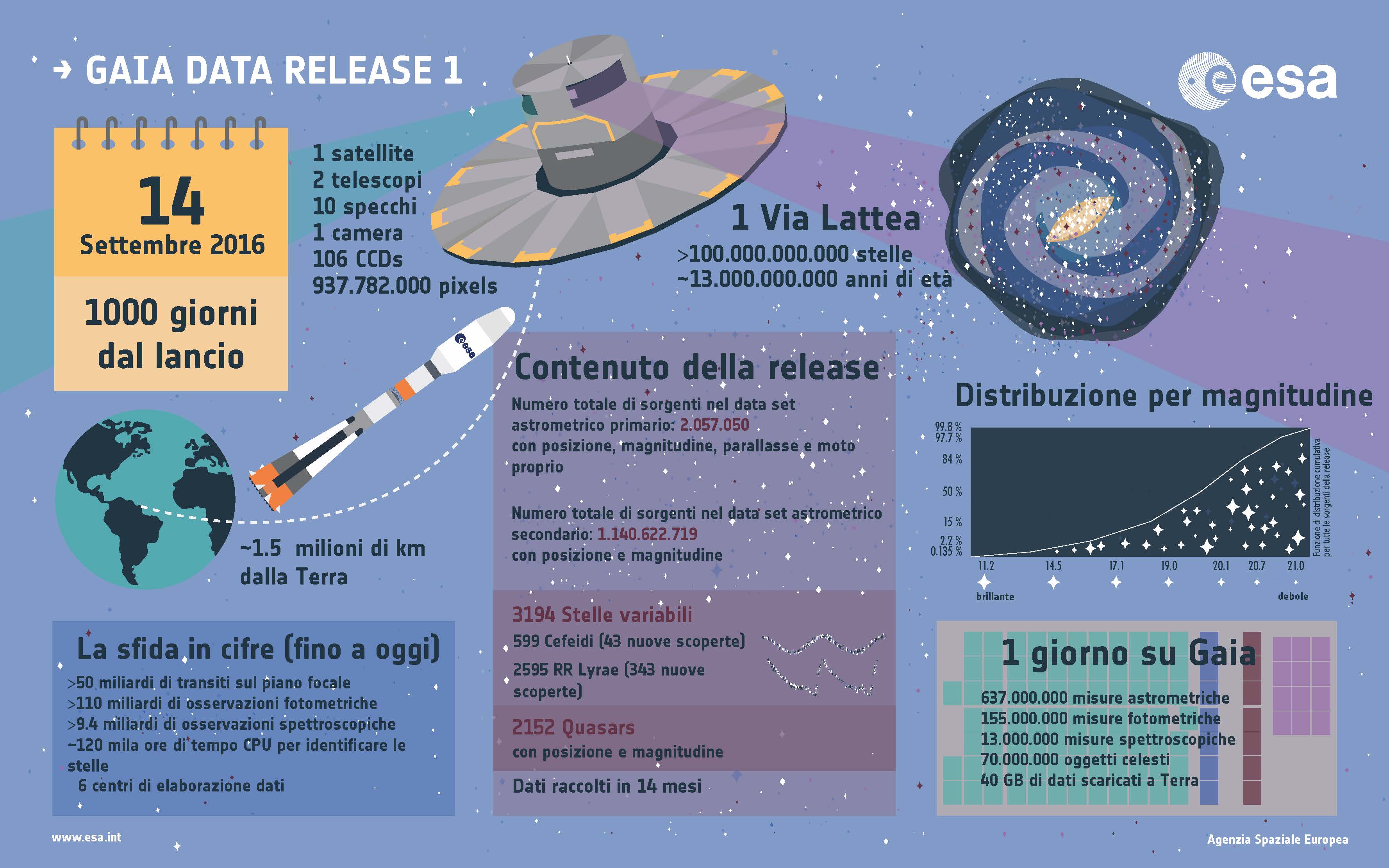 «La strada fino a oggi non è stata priva di ostacoli: Gaia ha dovuto far fronte a una serie di sfide tecniche che hanno richiesto un notevole sforzo collaborativo per essere superate», dice infine Fred Jansen, il mission manager di Gaia dell’ESA. «Ma ora, mille giorni dopo il lancio e grazie all’enorme lavoro di tutte le persone coinvolte, è con entusiasmo che possiamo presentare al mondo questo primo insieme di dati. E non vediamo l’ora d’arrivare alla prossima release, che mostrerà tutto il potenziale di Gaia nell’esplorazione nostra galassia, in un modo che non abbiamo mai visto prima».